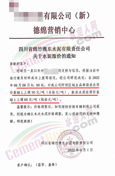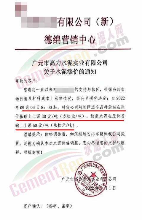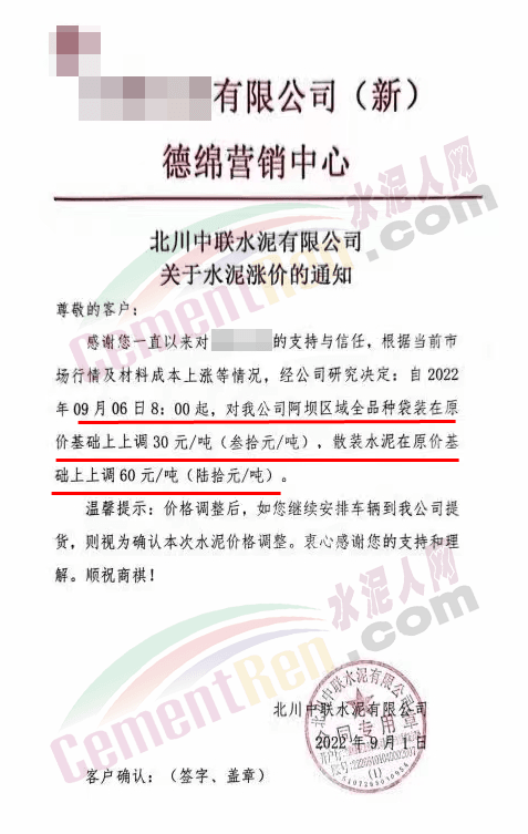 甘肅永固特種水泥有限公司通知因疫情影響等諸多原因,成本大幅上升。經(jīng)公司研究決定,自9月1日零時起,各型號水泥在原價基礎上上調(diào)30元/噸。