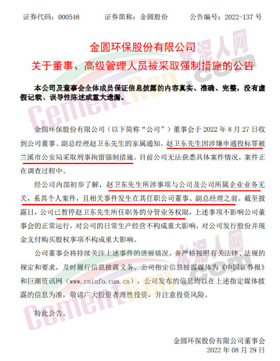 水泥人網(wǎng)消息,日前金圓環(huán)保發(fā)布公告稱收到公司董事、副總經理趙衛(wèi)東家屬通知,趙衛(wèi)東因涉嫌串通投標罪被蘭溪市公安局采取刑事拘留強制措施。公告提到,趙衛(wèi)東所涉事項與公司及公司所屬企業(yè)業(yè)務無關,系其個人案件,且相關事件發(fā)生在其任職公司董事、副總經理之前。且公司已暫停趙衛(wèi)東所任職務的分管業(yè)務權限。