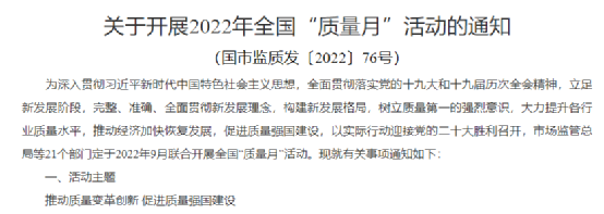 日前,國家市場監(jiān)管總局發(fā)布《關(guān)于開展2022年全國“質(zhì)量月”活動的通知》(國市監(jiān)質(zhì)發(fā)〔2022〕76號)提到,市場監(jiān)管總局等21個部門定于2022年9月聯(lián)合開展全國“質(zhì)量月”活動?;顒又黝}為“推動質(zhì)量變革創(chuàng)新 促進質(zhì)量強國建設(shè)”。