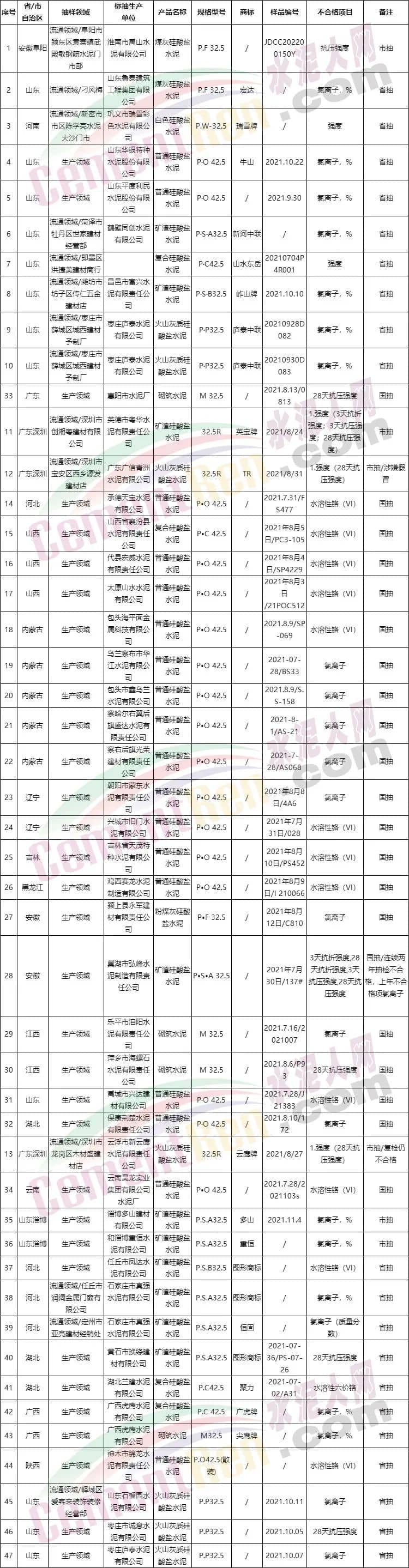 47批不合格水泥,32.5標號占比超50%,不合格項目涉及強度、氯離子水溶性鉻