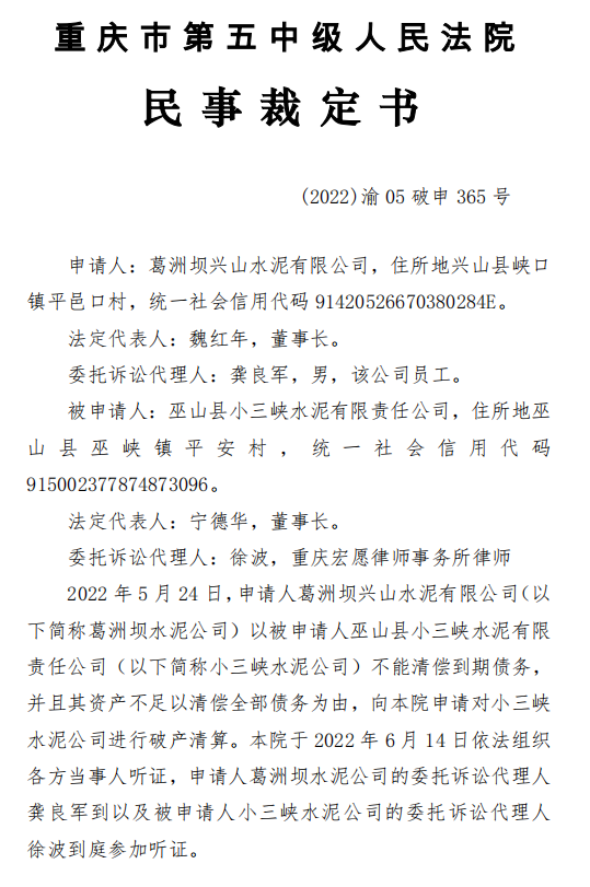 日前,重慶市第五中級(jí)人民法院發(fā)布的(2022)渝05破申365號(hào)《民事裁定書》提到,2022年5月24日,葛洲壩興山水泥有限公司以被申請人巫山縣小三峽水泥有限責(zé)任公司不能清償?shù)狡趥鶆?wù),并且其資產(chǎn)不足以清償全部債務(wù)為由,向重慶市第五中級(jí)人民法院申請對小三峽水泥公司進(jìn)行破產(chǎn)清算。
