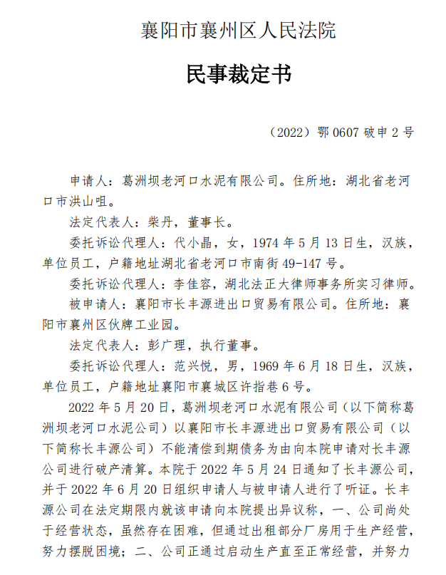同期,湖北襄陽市襄州區(qū)人民法院發(fā)布(2022)鄂 0607 破申 2 號(hào)《民事裁定書》提到,2022 年 5 月 20 日,葛洲壩老河口水泥有限公司以襄陽市長豐源進(jìn)出口貿(mào)易有限公司不能清償?shù)狡趥鶆?wù)為由向本院申請對長豐源公司進(jìn)行破產(chǎn)清算。法院于 2022 年 5 月 24 日通知了長豐源公司,并于 2022 年 6 月 20 日組織申請人與被申請人進(jìn)行了聽證。