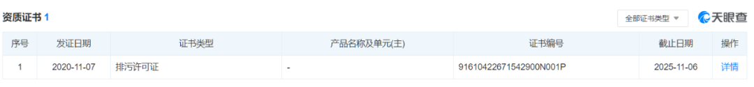企業(yè)資質(zhì)證書中也僅有排污許可證一項。