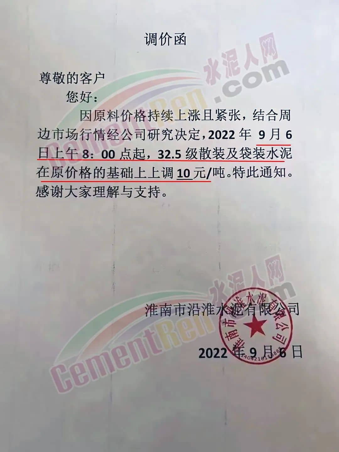 安徽淮南市禹山水泥有限公司、淮南市沿淮水泥有限公司通知,9月6日上午8時起,32.5袋裝、散裝水泥上調10元/噸。