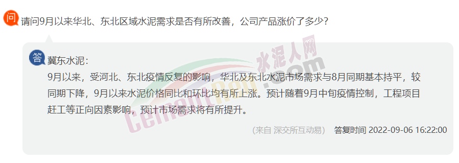 另有投資者提問,9月以來華北、東北區(qū)域水泥需求是否有所改善,公司產(chǎn)品漲價了多少?冀東水泥回復稱,9月以來,受河北、東北疫情反復的影響,華北及東北水泥市場需求與8月同期基本持平,較同期下降,9月以來水泥價格同比和環(huán)比均有所上漲。