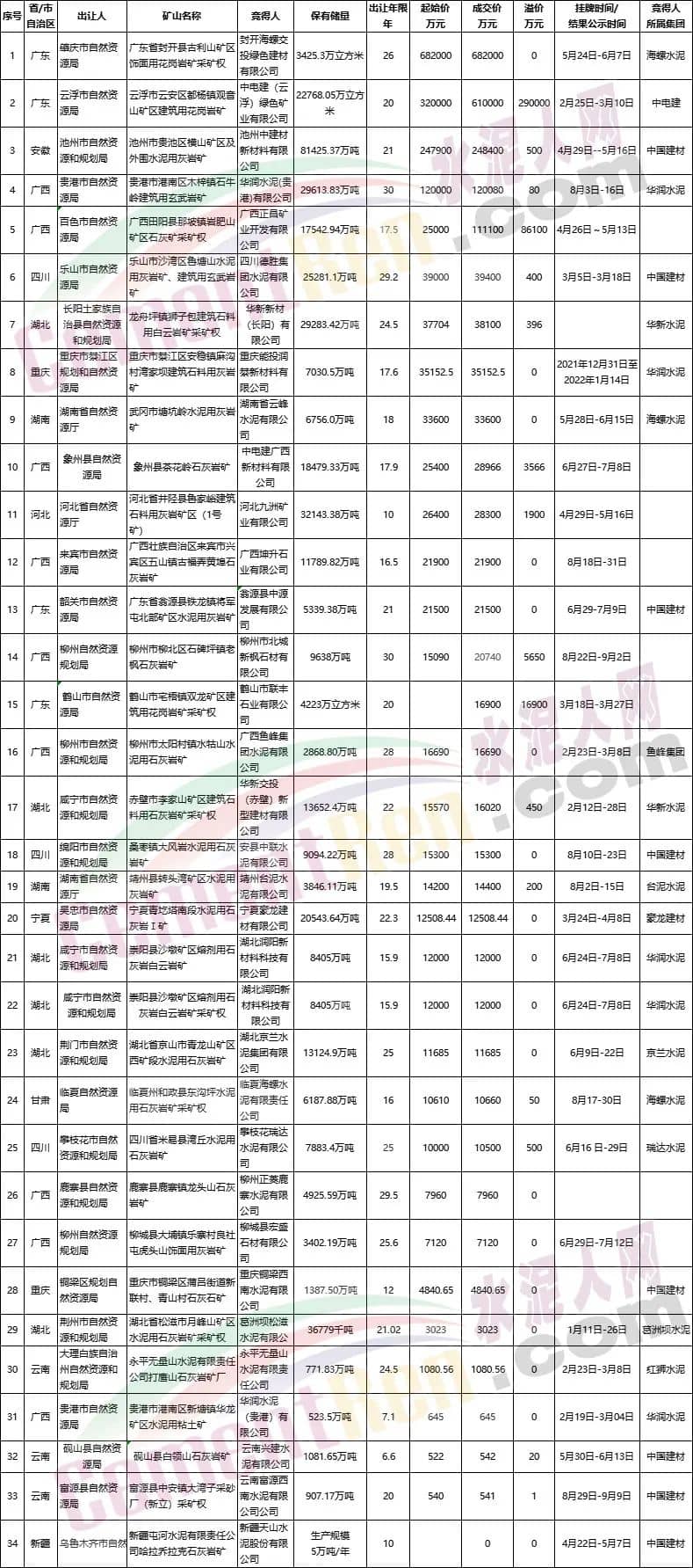 據(jù)水泥人網(wǎng)不完全統(tǒng)計,從近一年來公示公告的34宗采礦權(quán)掛牌出讓結(jié)果可見中國建材、海螺水泥、華潤水泥、華新水泥、紅獅水泥、臺泥水泥、豪龍建材、京蘭水泥等均有競得采礦權(quán)。其中,中國建材競得8宗采礦權(quán),華潤水泥競得5宗,海螺水泥、華新水泥各競得2宗采礦權(quán),其他企業(yè)僅競得1宗采礦權(quán)。