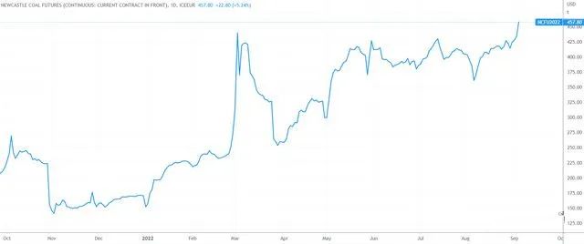 根據(jù)油價(jià)信息服務(wù)公司(OPIS)編制的每?jī)芍芤淮蔚闹笖?shù)顯示,上周五澳大利亞紐卡斯?fàn)柛郜F(xiàn)貨煤炭?jī)r(jià)格為每噸436.71美元,創(chuàng)下歷史新高,這幾乎是去年同期水平的三倍。