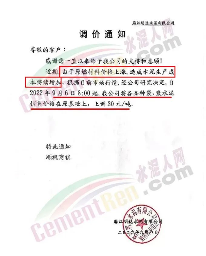 由于煤炭?jī)r(jià)格的不斷攀升,讓下游的水泥企業(yè)成本急劇上升,水泥企業(yè)也紛紛亮起漲價(jià)大旗,開(kāi)始了漲價(jià)模式。企業(yè)漲價(jià)通知多稱(chēng)因原燃材料價(jià)格上漲,成本增加。