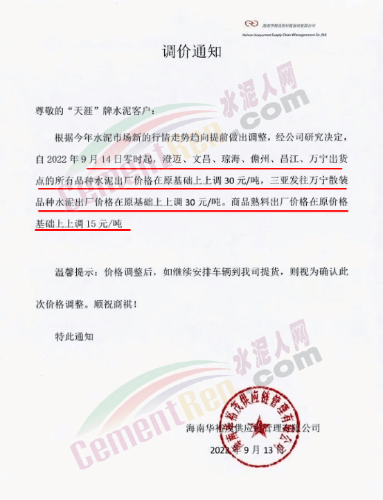 海南華昌茂供應(yīng)鏈管理有限公司、海南華裕茂供應(yīng)鏈管理有限公司通知,根據(jù)今年水泥市場新的行情走勢趨向提前做出調(diào)整,經(jīng)公司研究決定,自2022年9月14日零時起,澄邁、文昌、瓊海、儋州、昌江、萬寧出貨點的所有品種水泥出廠價格在原基礎(chǔ)上上調(diào)30元/噸,三亞發(fā)往萬寧散裝品種水泥出廠價格在原基礎(chǔ)上上調(diào)30元/噸。商品熟料出廠價格在原價格基礎(chǔ)上上調(diào)15元/噸。