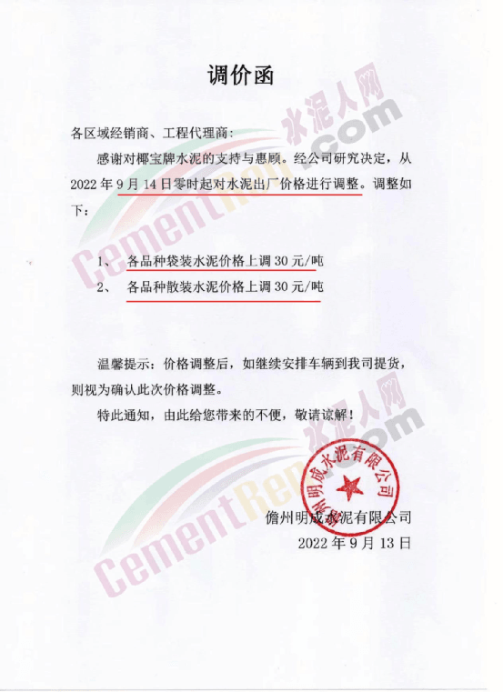 儋州明成水泥有限公司通知,自9月14日零時起對水泥出廠價格上調(diào)30元/噸。價格調(diào)整后,如繼續(xù)安排車輛到公司提貨,則視為確認(rèn)此次價格調(diào)整。