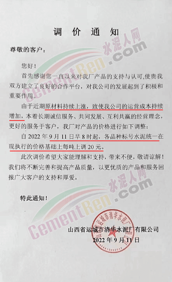 山西運城市清華水泥通知,由于近期原材料持續(xù)上漲,致使公司運營成本持續(xù)增加,自9月11日早8時起,各品種標(biāo)號水泥統(tǒng)一在現(xiàn)執(zhí)行價格基礎(chǔ)上上調(diào)20元/噸。