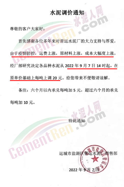 運城市鹽湖區(qū)晉運水泥銷售部通知,由于疫情防控、運費上漲、原材料上漲、成本大幅度上漲,從9月7日14時起,在原價基礎(chǔ)上上調(diào)20元/噸。
