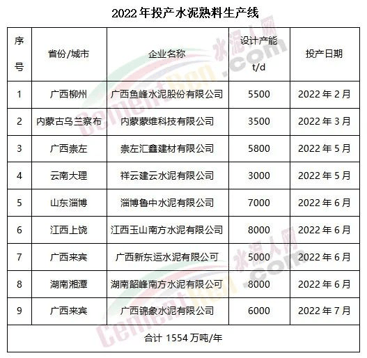 據(jù)水泥人網(wǎng)不完全統(tǒng)計(jì),今年以來,截至七月底共投產(chǎn)水泥熟料產(chǎn)線9條,合計(jì)熟料產(chǎn)能1554萬噸。僅廣西區(qū)域就有4條水泥熟料生產(chǎn)線,熟料產(chǎn)能合計(jì)達(dá)669萬噸/年。