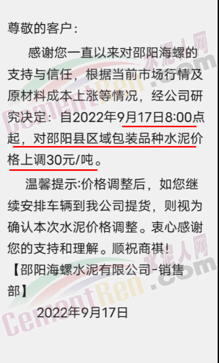 邵陽海螺水泥有限公司銷售部通知,根據(jù)當(dāng)前市場行情及原材料成本上漲等情況,自9月17日8時起,對邵陽縣區(qū)域包裝水泥上調(diào)30元/噸。