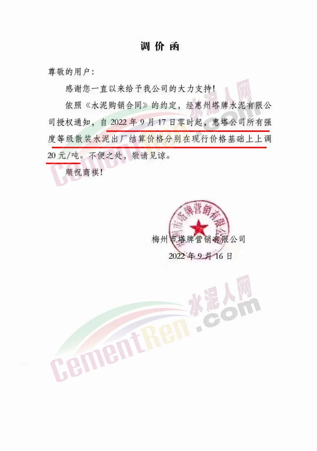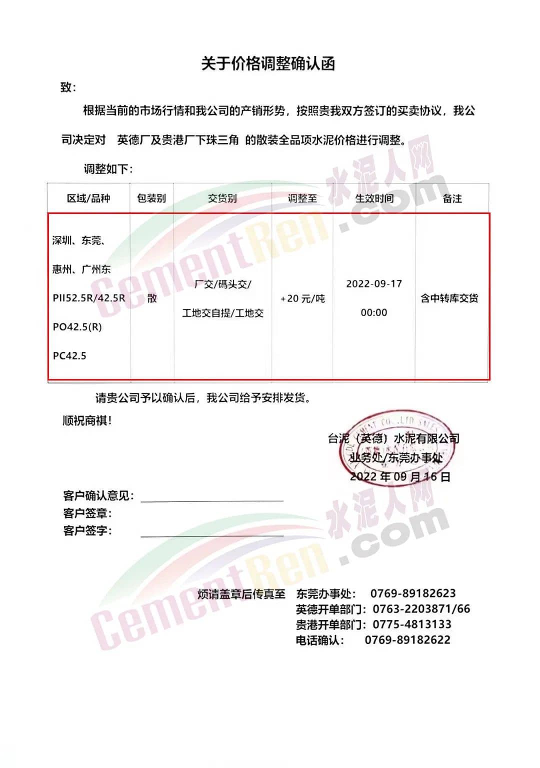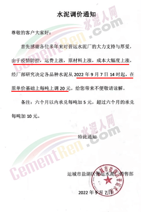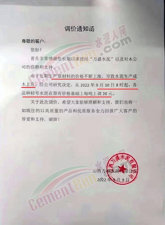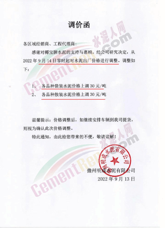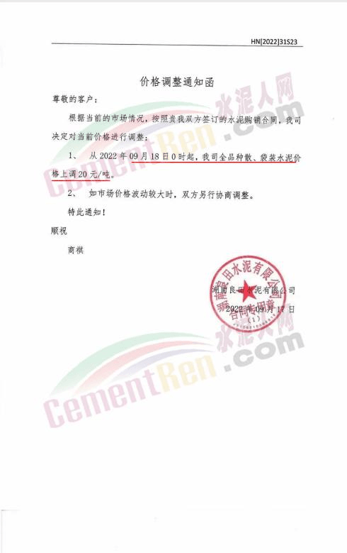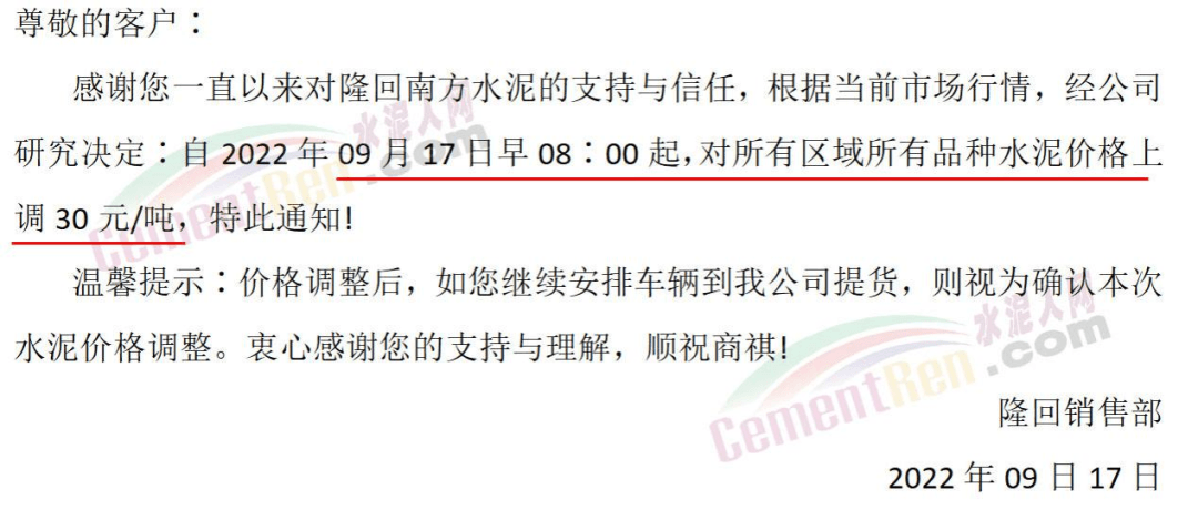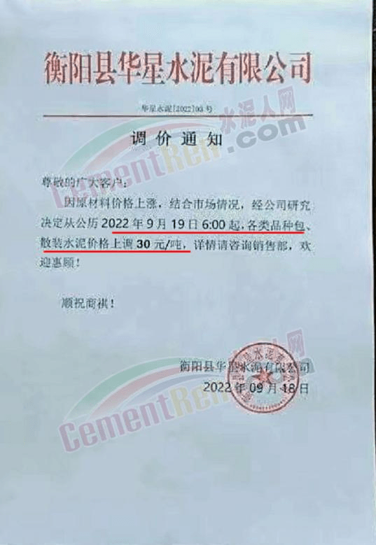 雙峰海螺水泥有限公司通知,根據(jù)當(dāng)前市場行情以及材料成本上漲等情況,經(jīng)公司研究決定,自2022年9月17日800起,對各品種水泥的掛牌出廠價格上調(diào)30元/噸。