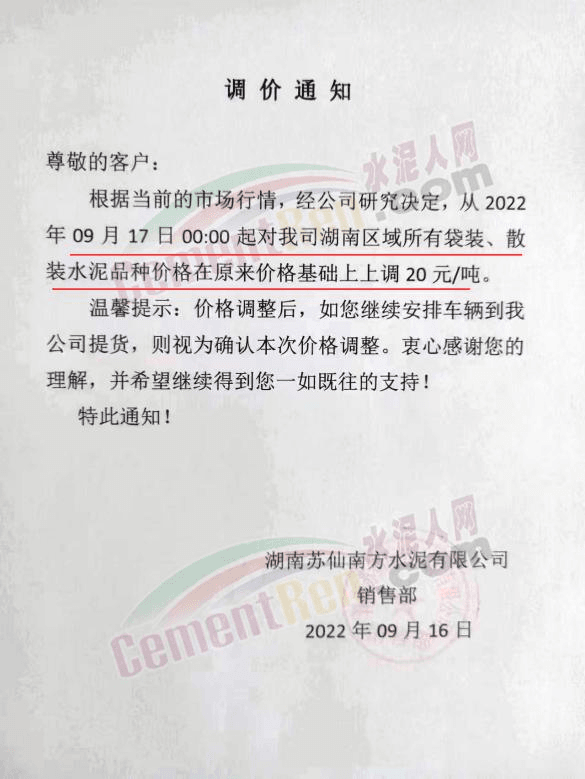 湖南蘇仙南方通知,自9月17日0時起對湖南區(qū)域所有袋裝、散裝水泥價格上調(diào)20元/噸。