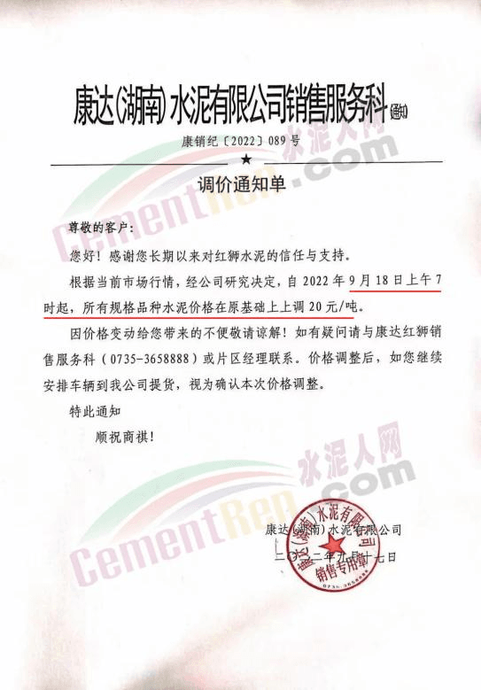 紅獅水泥旗下康達(湖南)水泥有限公司銷售服務(wù)科通知自9月18日上午7時起,所有規(guī)格品種水泥價格在原基礎(chǔ)上上調(diào)20元/噸。