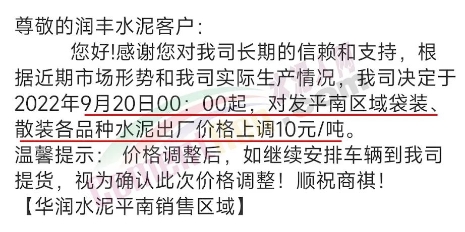 廣西貴港華潤平南水泥有限公司通知9月20日0時起,對發(fā)平南區(qū)域袋裝、散裝各品種水泥出廠價上調(diào)10元/噸。