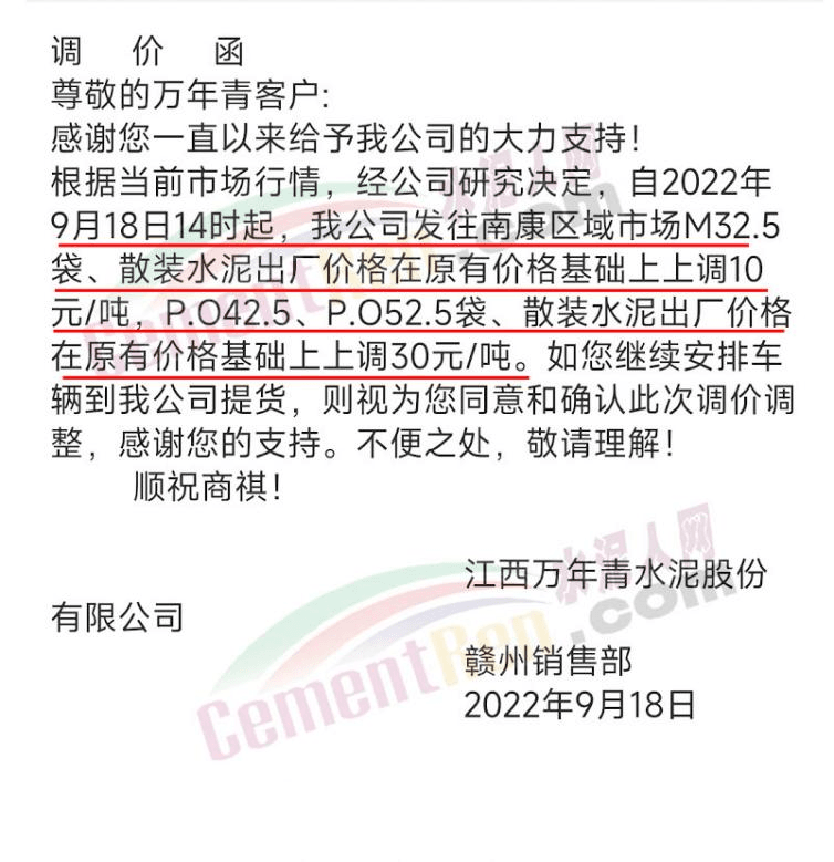 江西萬年青水泥股份有限公司贛州銷售部通知根據(jù)當(dāng)前市場行情,經(jīng)公司研究決定,自9月18日14時起,公司發(fā)往南康區(qū)域市場M32.5 袋、散裝水泥出廠價格在原有價格基礎(chǔ)上上調(diào)10 元/噸,P.042.5、P.052.5袋、散裝水泥出廠價格在原有價格基礎(chǔ)上上調(diào)30元/噸。