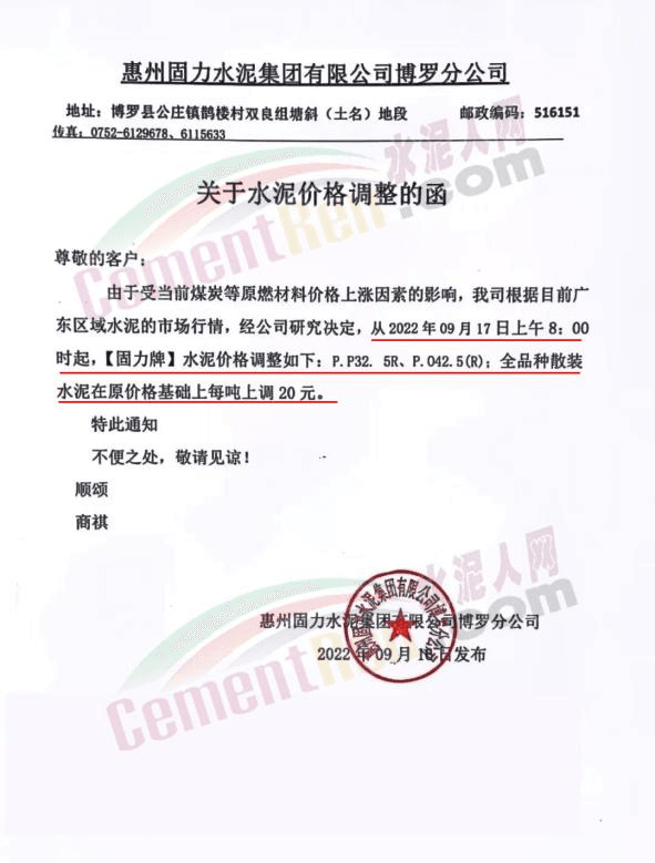 廣東華潤、塔牌、臺泥、光大、羅浮山等企業(yè)調(diào)漲20元/噸