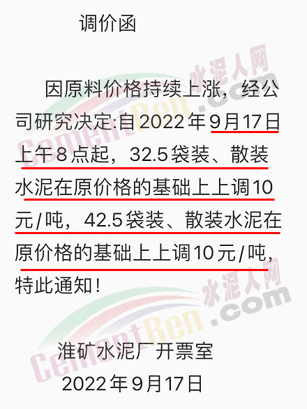 淮礦水泥廠開票室通知,因原料價格持續(xù)上漲,經(jīng)公司研究決定∶自9月17日上午8點起,32.5袋裝、散裝水泥在原價格的基礎(chǔ)上上調(diào)10 元/噸,42.5袋裝、散裝水泥在原價格的基礎(chǔ)上上調(diào)10元/噸。