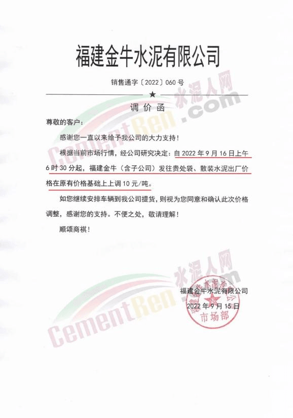 福建金牛水泥通知9月16日上午6時30分起上調(diào)水泥價格10元/噸。
