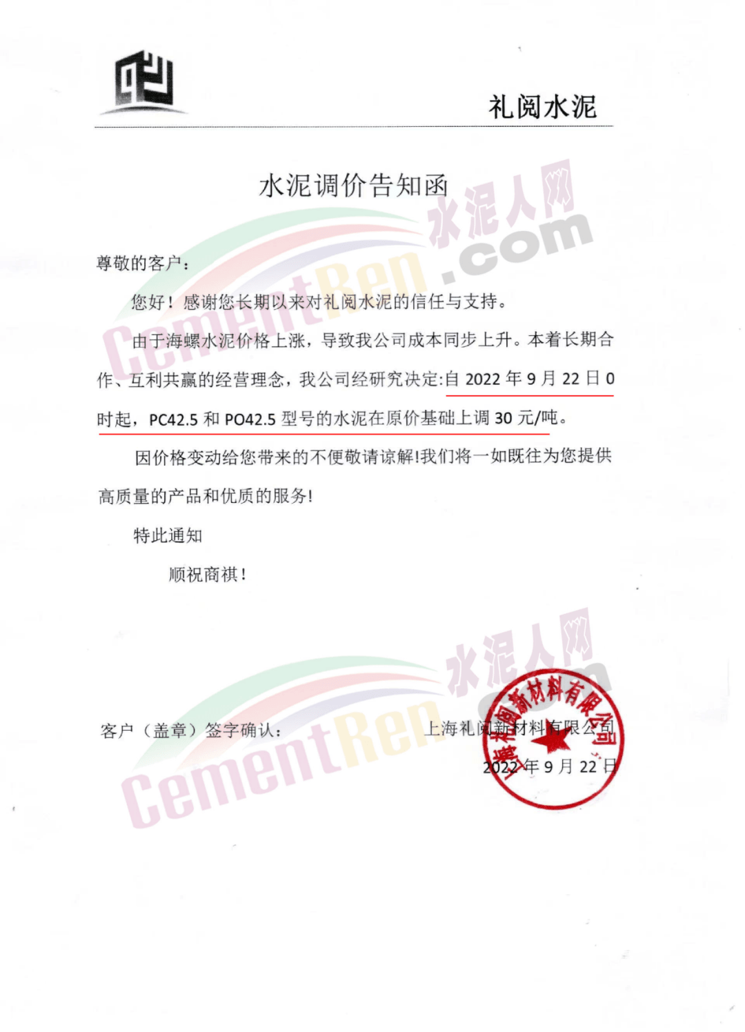日前,由于海螺水泥價格上漲,上海禮閱新材料有限公司發(fā)布調(diào)價通知稱,導(dǎo)致公司成本同步上升,經(jīng)公司研究決定自9月22日0時起,PC42.5和PO42.5型號的水泥在原價基礎(chǔ)上上調(diào)30元/噸。
