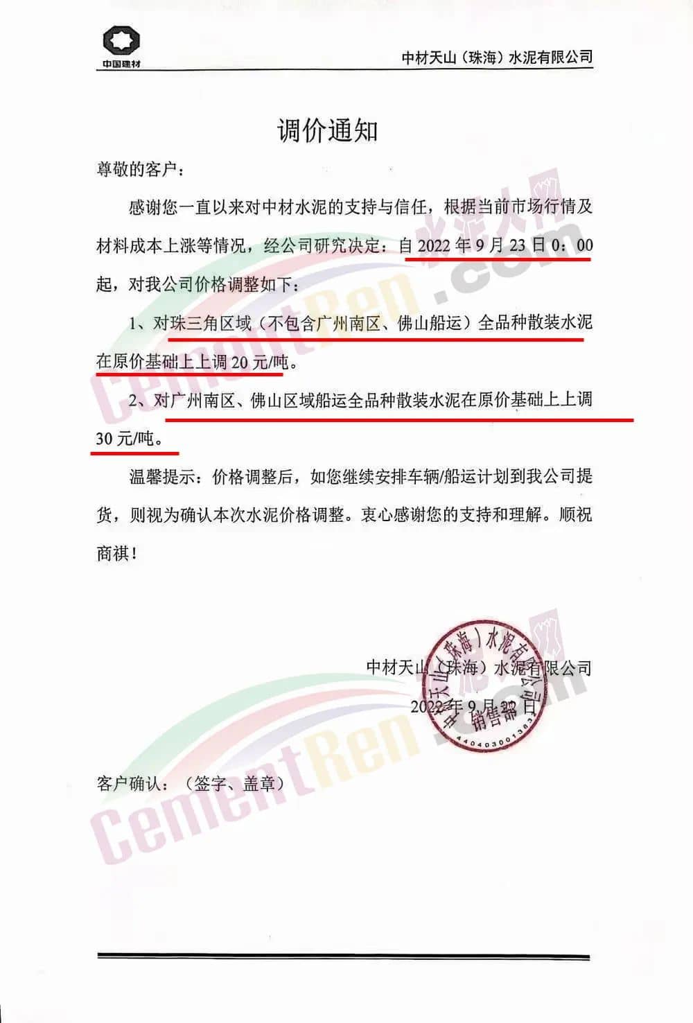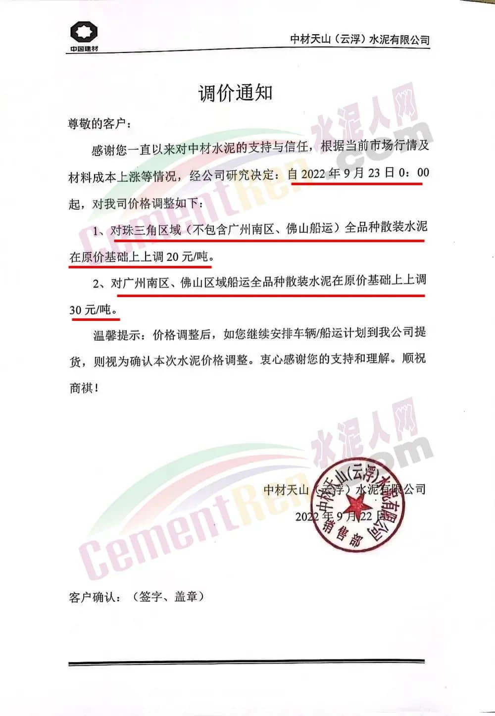 中材天山(云浮)水泥有限公司、中材天山(珠海)水泥有限公司等通知,自9月23日0時起對珠三角區(qū)域不包括廣州南區(qū)和佛山船運,全品種散裝水泥在原價基礎(chǔ)上上調(diào)20元/噸。對廣州南區(qū)、佛山區(qū)域船運全品種散裝水泥上調(diào)30元/噸。