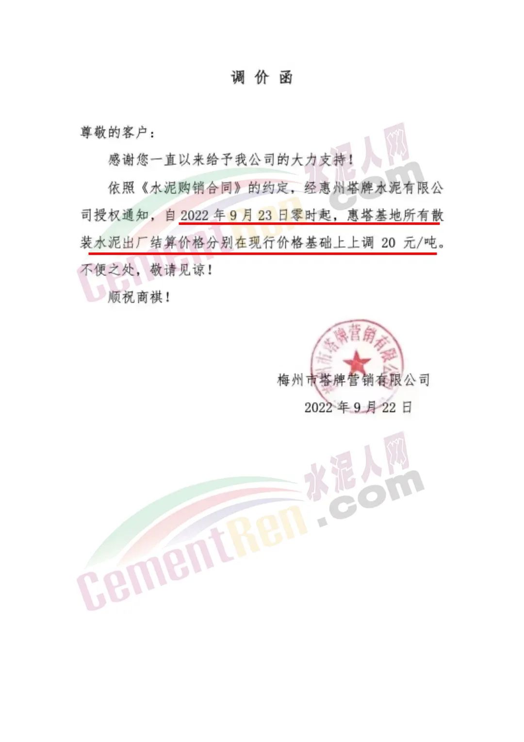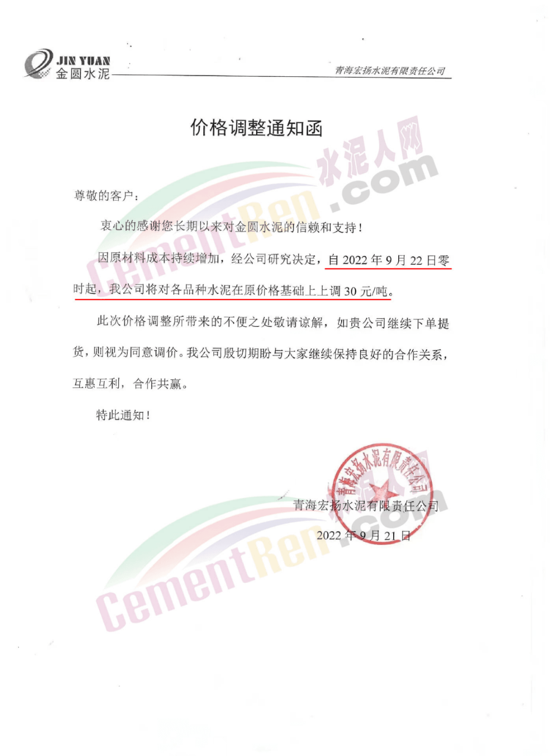 同期,區(qū)域內(nèi)海螺水泥通知自2022年9月21日中午12:00起對各區(qū)域各市場客戶,PC42.5包裝水泥和M32.5包裝水泥均上調(diào)50元/噸。