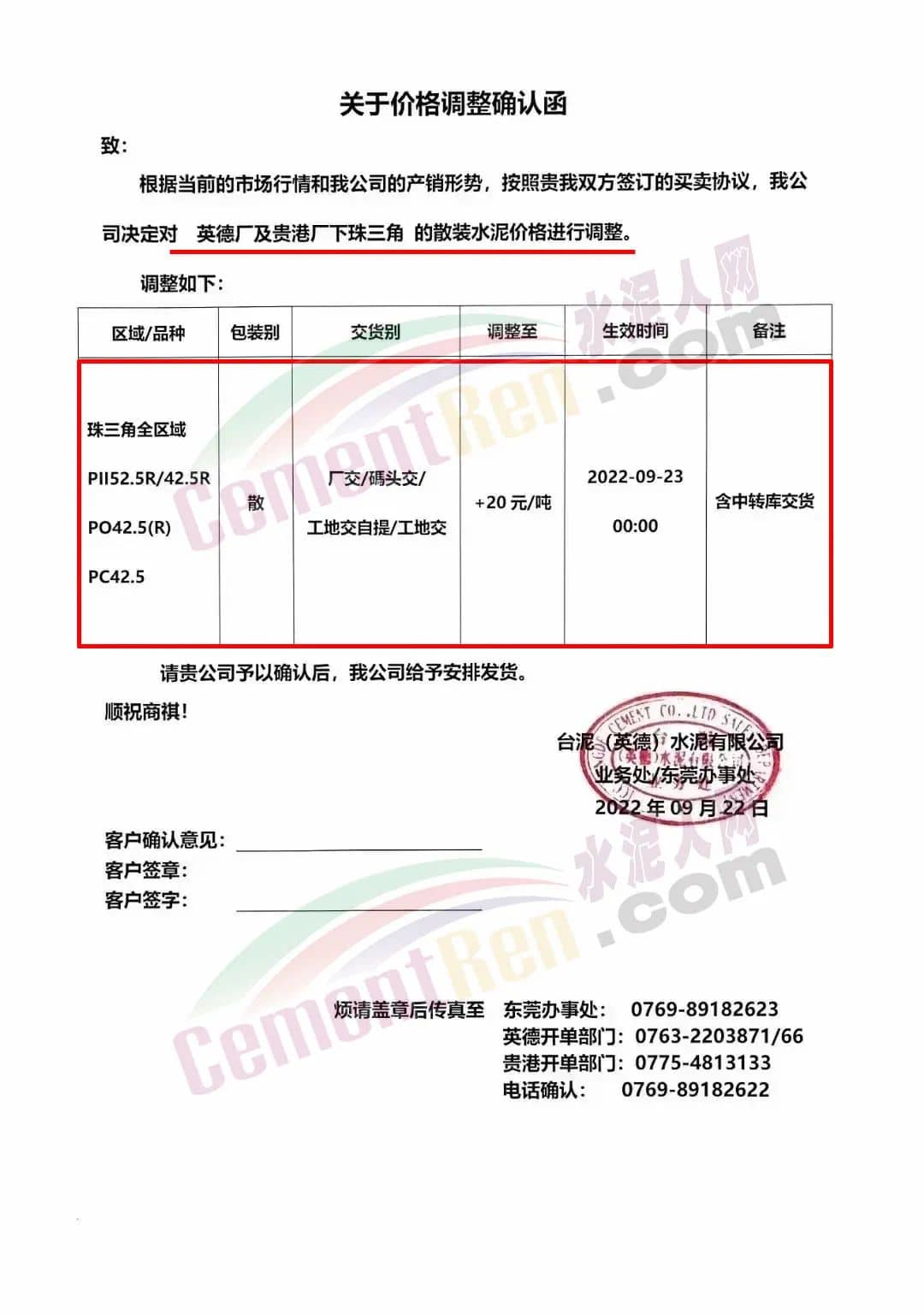 廣東珠三角區(qū)域主要品牌企業(yè)塔牌、中材、臺泥等主要品牌企業(yè)通知,23日起水泥價格上調(diào)20-30元/噸。