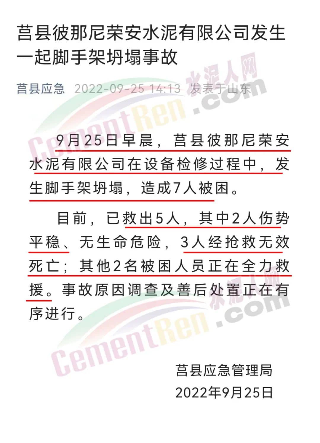 9月25日,莒縣應(yīng)急官微發(fā)布消息,9月25日早晨,莒縣彼那尼榮安水泥有限公司在設(shè)備檢修過(guò)程中,發(fā)生腳手架坍塌,造成7人被困。