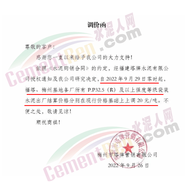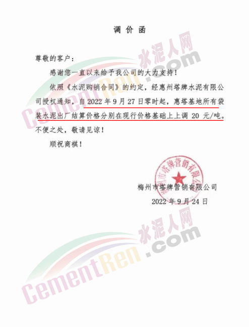梅州市塔牌營(yíng)銷(xiāo)有限公司自2022年9月29日零時(shí)起,福塔、梅州基地各廠(chǎng)所有PP325(R)及以上強(qiáng)度等級(jí)袋裝水泥出廠(chǎng)結(jié)算價(jià)格分別在現(xiàn)行價(jià)格基礎(chǔ)上上調(diào)20元/噸。