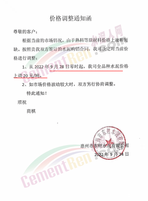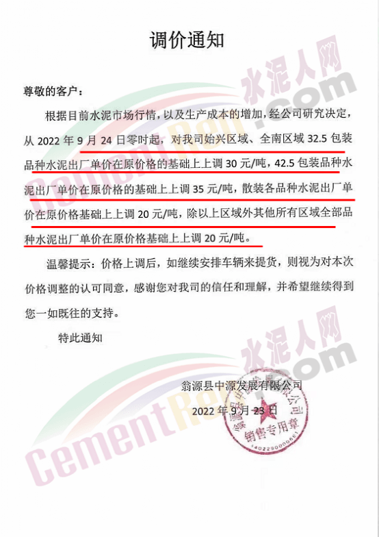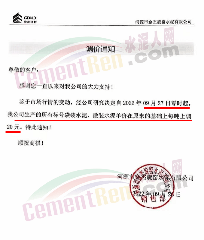 河源市金杰旋窯水泥有限公司通知鑒于市場(chǎng)行情的變動(dòng),經(jīng)公司研究決定自2022年09月27日零時(shí)起公司生產(chǎn)的所有標(biāo)號(hào)袋裝水泥、散裝水泥單價(jià)在原來(lái)的基礎(chǔ)上每噸上調(diào)20元。