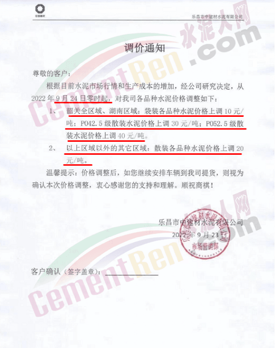 樂(lè)昌市三益水泥有限公司通知,自9月26日起,上調(diào)水泥價(jià)格50元/噸。