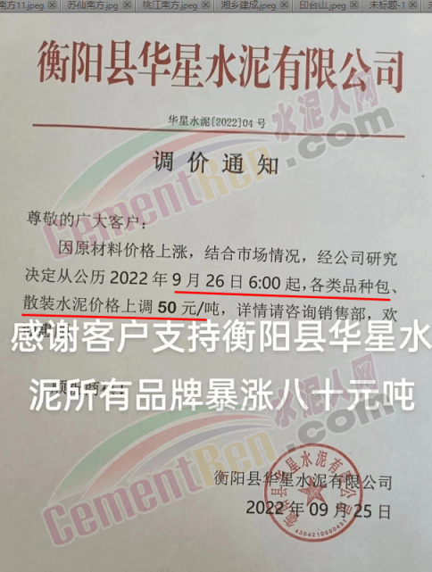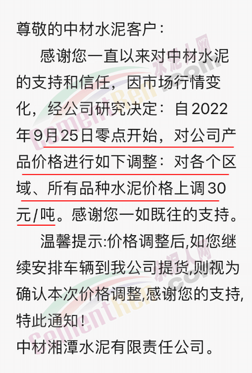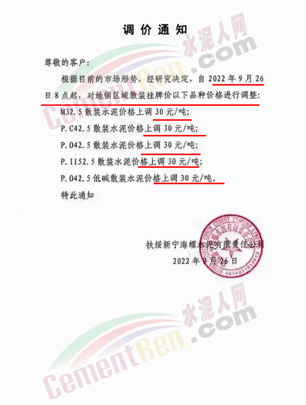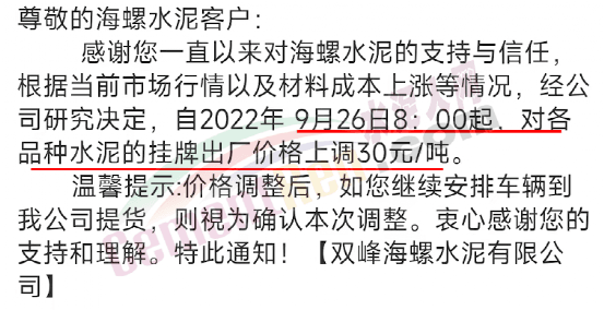 雙峰海螺水泥通知自2022年 9月26日8:00起,對(duì)各品種水泥的掛牌出廠(chǎng)價(jià)格上調(diào)30元/噸。