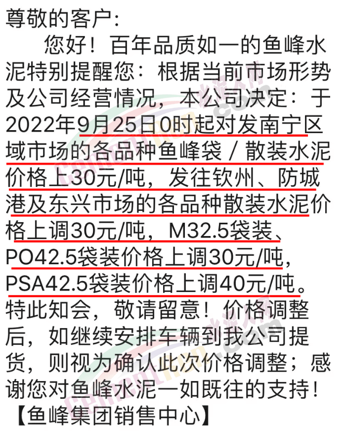 魚(yú)峰集團(tuán)銷(xiāo)售中心通知,自9月25日0時(shí)起對(duì)發(fā)南寧及欽州、防城港及東興市場(chǎng)散裝水泥價(jià)格上調(diào)30-40元/噸。
