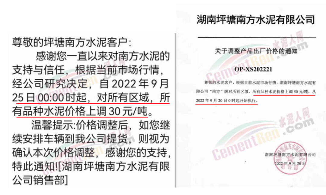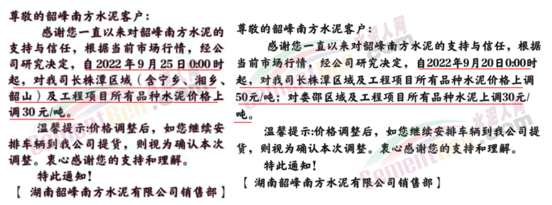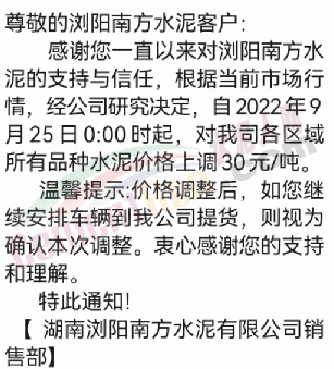 瀏陽(yáng)南方水泥通知25日起上調(diào)30元/噸,