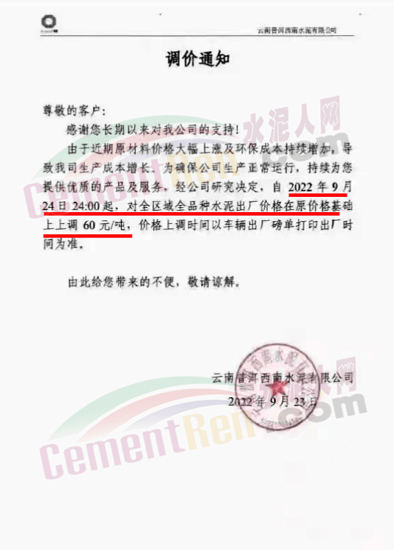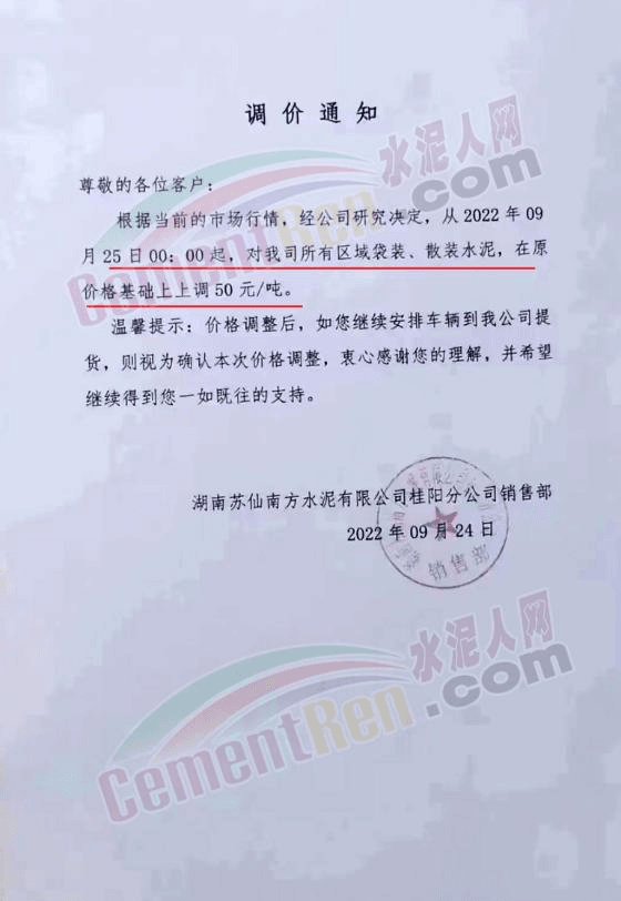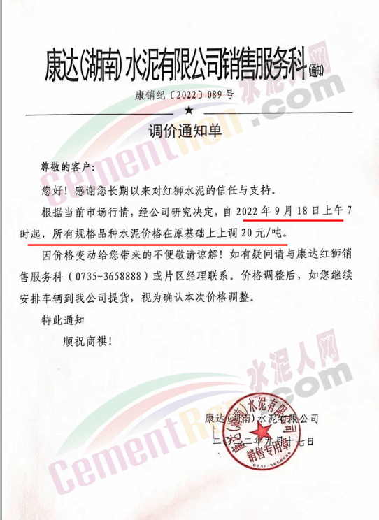 桂林南方水泥有限公司通知, 根據(jù)當(dāng)前市場(chǎng)形勢(shì)及我司生產(chǎn)情況,公司決定于2022年9月26日0:00起,對(duì)各品種袋裝水泥價(jià)格上調(diào)30元/噸、各品種散裝水泥價(jià)格上調(diào)20元/噸。