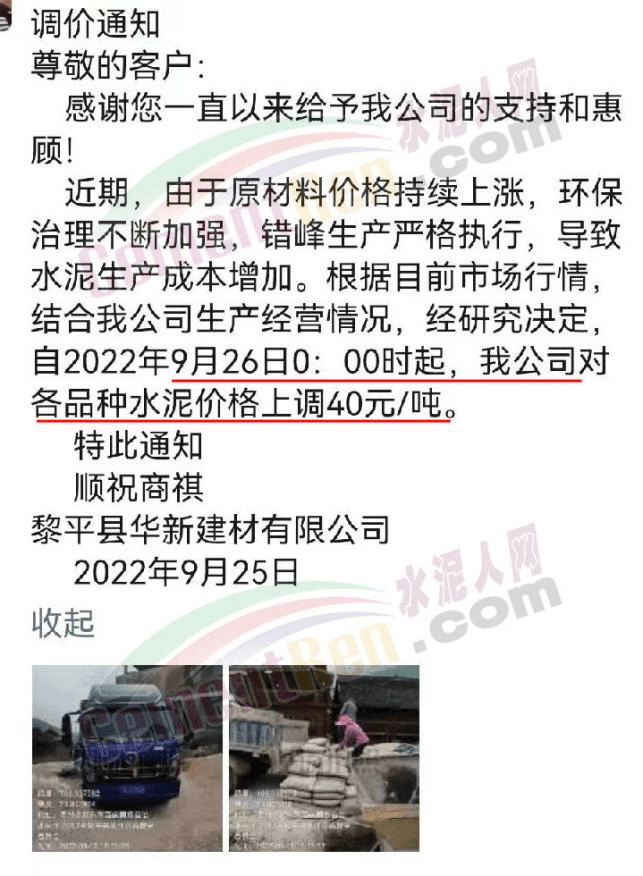 貴州省黔東南苗族侗族自治州黎平縣華新建材有限公司通知,由于原材料價(jià)格持續(xù)上漲,環(huán)保治理不斷加強(qiáng),錯(cuò)峰生產(chǎn)嚴(yán)格執(zhí)行,導(dǎo)致水泥生產(chǎn)成本增加。根據(jù)市場(chǎng)行情 ,自9月26日0時(shí)起,公司對(duì)各品種水泥價(jià)格上調(diào)40元/噸。