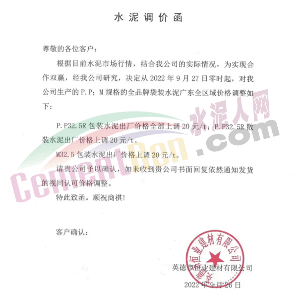 英德市粵華水泥有限責(zé)任公司發(fā)布通知稱,自2022年9月29日0:00起,PC42.5、PSA32.5R、PC42.5、PSA32.5R上調(diào)20元/噸。
