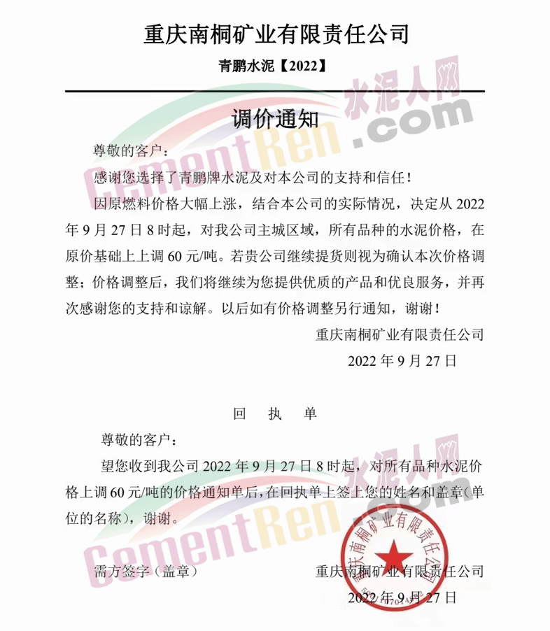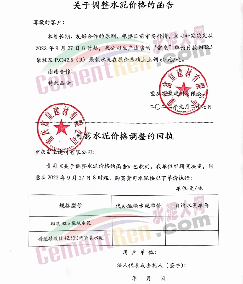 重慶市富豐水泥集團(tuán)特種水泥有限公司發(fā)布通知稱:根據(jù)目前市場行情變化,經(jīng)我司研究決定,從2022年9月27日早上8:00起,供應(yīng)貴公司各型號水泥出廠價(jià)格在原基礎(chǔ)上上調(diào)60元/噸。