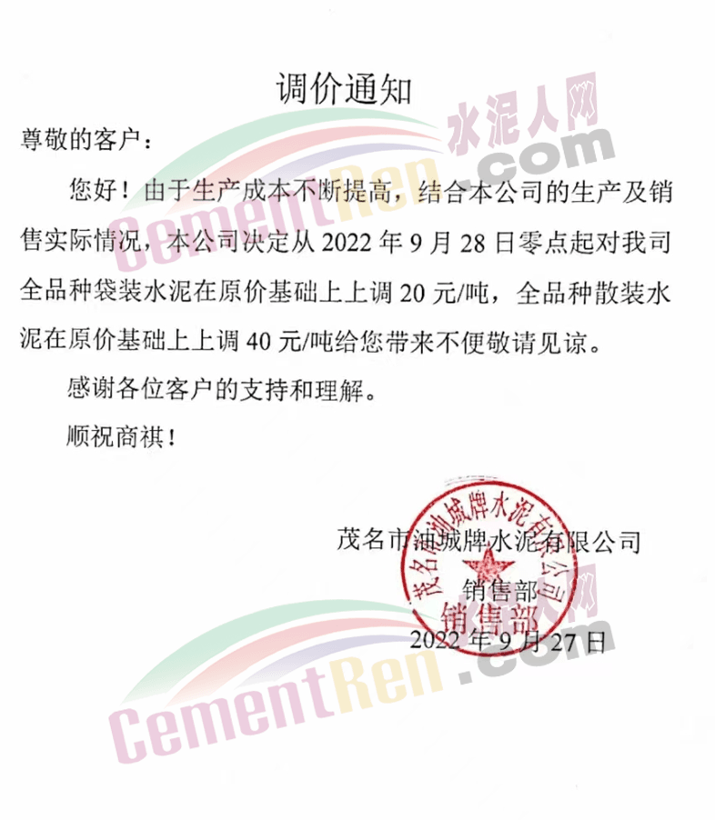 茂名市油城牌水泥有限公司發(fā)布通知稱:本公司決定從2022年9月28日零點(diǎn)起對我司全品種袋裝水泥在原價(jià)基礎(chǔ)上上調(diào)20元/噸,全品種散裝水泥在原價(jià)基礎(chǔ)上上調(diào)40元/噸。