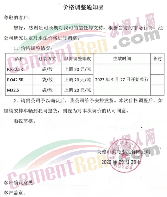 英德市英海水泥有限公司發(fā)布通知稱,自2022年9月27日起,P.P32.5R、PO42.5R、M32.5袋裝、散裝水泥價(jià)格上調(diào)20元/噸。