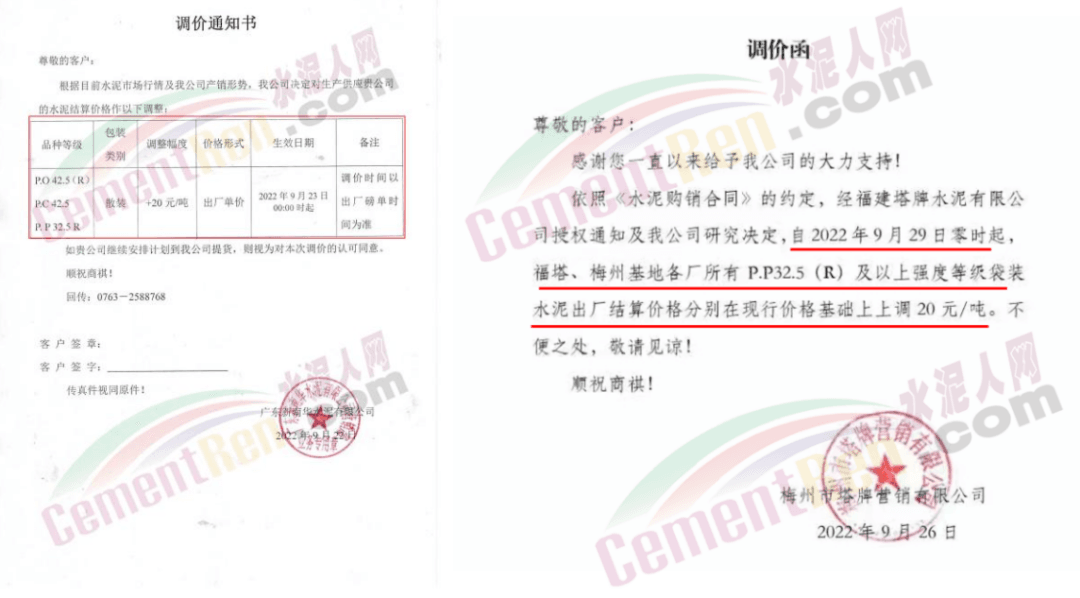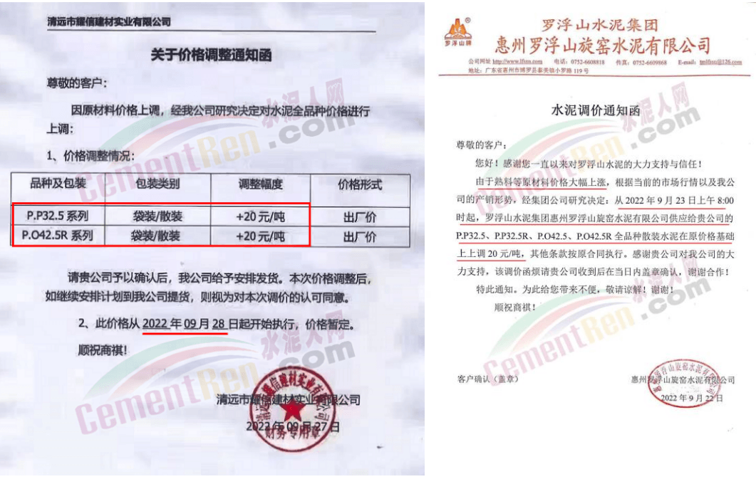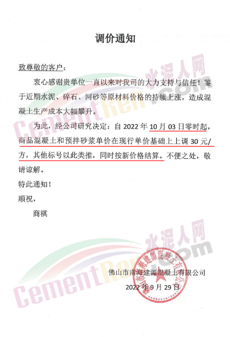 水泥人網(wǎng)通訊員消息:日前,廣東佛山市南海建源混凝土有限公司、佛山市南海區(qū)泌沖水泥混凝土有限公司等企業(yè)通知,鑒于近期水泥、碎石、河砂等原材料價(jià)格的持續(xù)上漲,造成混凝土生產(chǎn)成本大幅攀升。經(jīng)公司研究決定,自2022年10月3日零時(shí)起,商品混凝土和預(yù)拌砂漿價(jià)格上調(diào)30元/方,其他標(biāo)號(hào)以此類推,同時(shí)按新價(jià)格結(jié)算。