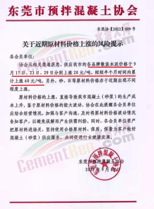 不僅佛山市商砼企業(yè)成本上漲,近期東莞市預(yù)拌混凝土協(xié)會(huì)發(fā)布《關(guān)于近期原材料價(jià)格上漲的風(fēng)險(xiǎn)提示》稱,供應(yīng)東莞市的各品牌散裝水泥價(jià)格于9 月17日、23日、29日分別上漲20元/噸,短短半個(gè)月時(shí)間內(nèi)累計(jì)上漲60元/噸。另外,砂、石等原材料價(jià)格亦于近期出現(xiàn)不同程度上漲。原材料價(jià)格上漲,直接導(dǎo)致混凝土(砂漿)的生產(chǎn)成本上升。鑒于原材料價(jià)格的較大波動(dòng),協(xié)會(huì)在此提醒各會(huì)員單位應(yīng)結(jié)合經(jīng)營(yíng)情況,加強(qiáng)與客戶溝通,及時(shí)將原材料價(jià)格波動(dòng)情況告知客戶,以避免誤解而產(chǎn)生供需糾紛。
