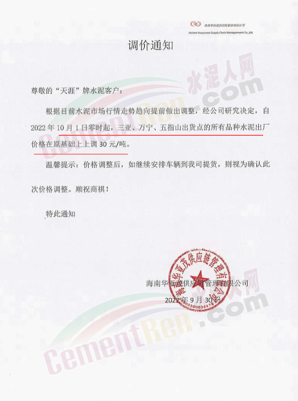 海南主要品牌企業(yè)通知10月1日零時(shí)起,三亞、萬(wàn)寧、五指山出貨點(diǎn)的所有品種水泥出廠價(jià)在原基礎(chǔ)上上調(diào)30元/噸。區(qū)域內(nèi)主要品牌企業(yè)曾于9月中旬期間上調(diào)水泥價(jià)格30元/噸,熟料同步上調(diào)15元/噸。