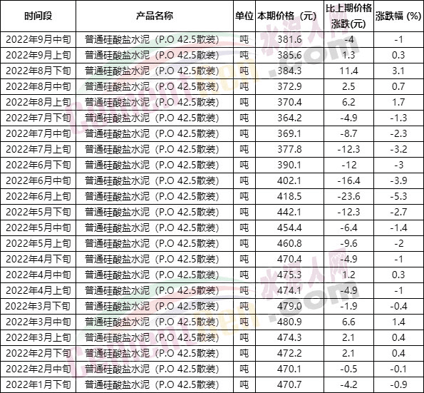 從國(guó)家統(tǒng)計(jì)局近期公布的流通領(lǐng)域水泥報(bào)價(jià)來(lái)看,2022年9月中旬P.O42.5散裝水泥報(bào)價(jià)381.6元/噸,上年同期報(bào)價(jià)為460.4元/噸,價(jià)差78.8元/噸。環(huán)比今年1月下旬470.7元/噸,價(jià)差89.1元/噸。2022年1月下旬至9月中旬之間,P.O42.5散裝水泥最高報(bào)價(jià)出現(xiàn)在3月中旬480.9元/噸,最低價(jià)為7月下旬364.2元/噸,差價(jià)116.7元/噸。