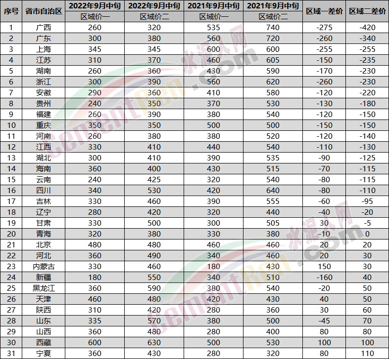 分區(qū)域來(lái)看,9月份里,廣東、廣西、湖南、湖北、江西、福建、浙江、江蘇、山東、河南、河北、山西、甘肅、青海、云南、貴州、四川、上海、北京、天津等20多個(gè)區(qū)域都曾上調(diào)水泥價(jià)格,單次上調(diào)最高的是北京金隅發(fā)往承德區(qū)域一次性上調(diào)130元/噸; 累計(jì)上調(diào)最高的是湖南區(qū)域部分企業(yè)連漲5次,累計(jì)上調(diào)160元/噸。