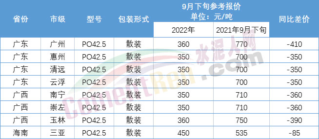 水泥人網(wǎng)信息中心數(shù)據(jù)顯示,今年二、三季度水泥價(jià)格都處于相對(duì)較低的狀態(tài),與上年9月中旬相比,廣西區(qū)域27家主要品牌企業(yè)出廠報(bào)價(jià)為260-320元/噸,均價(jià)已在300元/噸以下。上年同期廣西區(qū)域出廠價(jià)最高達(dá)740元/噸,最低也要535元/噸左右,同比價(jià)格下跌275-420元/噸。9月下旬,同比上年同期,華南廣東、廣西區(qū)域各區(qū)域參考均價(jià)與上年同比差價(jià)高達(dá)350-410元/噸。