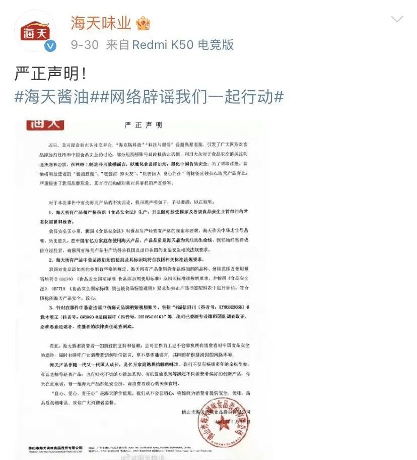 作為巨無霸企業(yè),調味品行業(yè)的“茅臺”,海天味業(yè)第一份聲明,更像一份警告函,絕大多數(shù)的篇幅都是在推卸,指責曝光者,而對此次添加劑,對廣大消費者,并沒有一絲歉意。